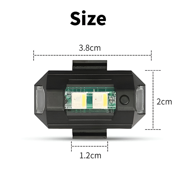 📏 Compacto e leve – 3,8 x 2 cm, estrutura em ABS, conjunto de 2 luzes com almofadas de velcro, anéis de borracha e cabo de carregamento USB incluídos.